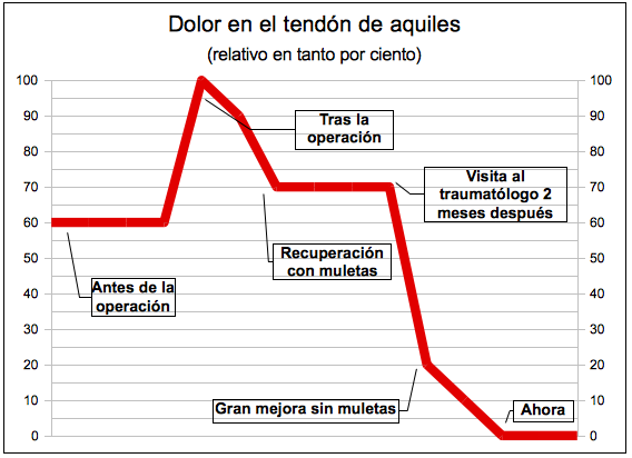 la revisión del traumatólogo hace unas 3 semanas.En la siguiente gráfica que he hecho se puede ver cómo ha ido la evolución del dolor en tanto por ciento (teniendo en cuenta que el 100% representa el dolor máximo que he tenido en el tendón).